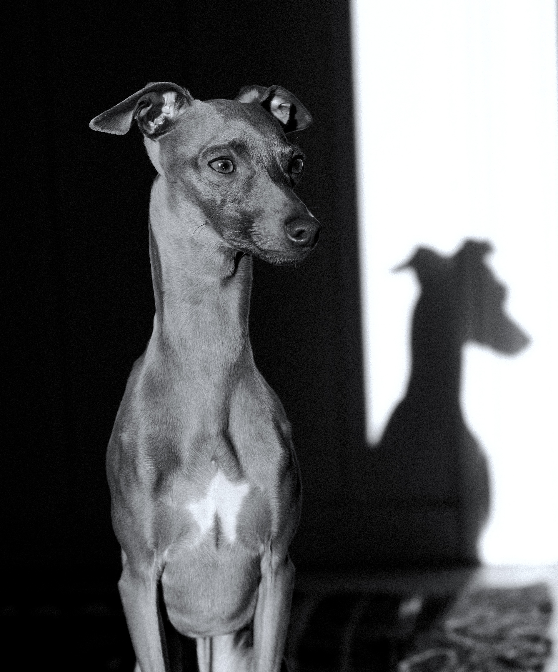 Dog posing with a shadow backdrop showing the classic greyhound silhouette.